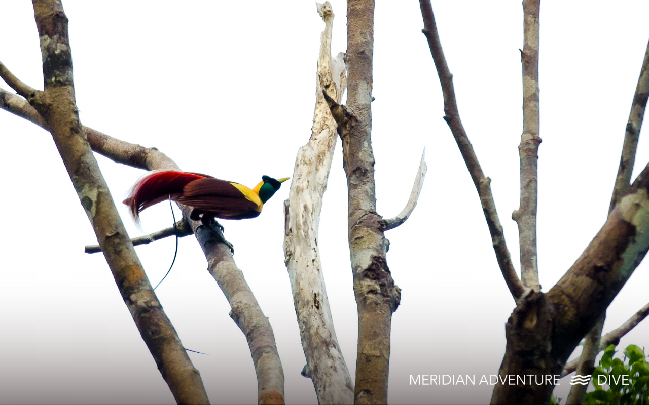 A bird-of-paradise perched on bare branches in Raja Ampat, showing bright yellow, green, and red plumage.